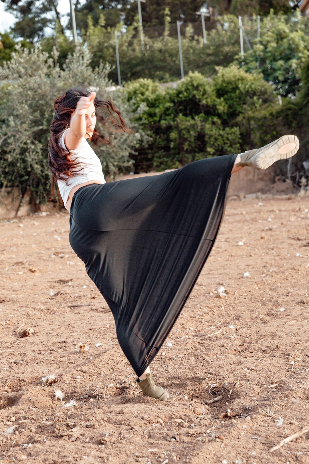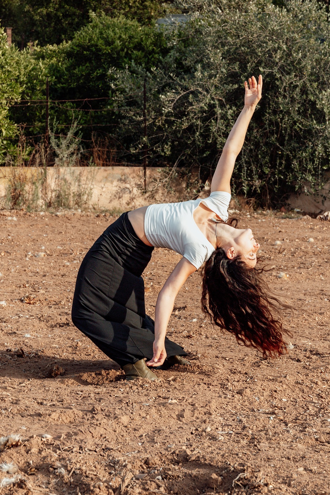 zwischen Vergangenheit und lebendigem Tanz kommt hier zum Ausdruck. Der Pavillon, er gibt Gala Schutz und Tiefe. Erst als zweite Location wählen wir das offene Feld. Die Tänzerin sinkt bis zu den Knöcheln in die lockere Erde, doch sie ist jetzt nicht mehr zu stoppen. Keine rostigen Fenster, kein Beton grenzt ihre Bewegungen ein. Hier vergisst sie die Kamera und die Welt um sich herum. Mit dem Shooting hat sich Gala auf eine kleine Reise begeben – zurück in die Vergangenheit, vorwärts in die Freiheit.
